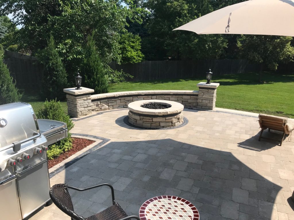 Scope of Work / Additional Details:  Unilock Brussels Block Pavers with Rivercrest Walls. Borders with Copthorne Basalt