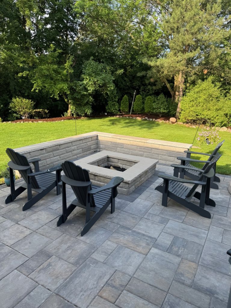 The project included a patio, sidewalk, grill enclosure/outdoor kitchen, fire pit, and pavilion. The hardscape features Unilock Beacon Hill Flagstone in Alpine Grey, accented with a Beacon Hill 7×15 Charcoal border for a crisp, contemporary contrast. U-Cara walls added both structure and visual depth, while a custom structural pavilion provided shade and architectural presence.